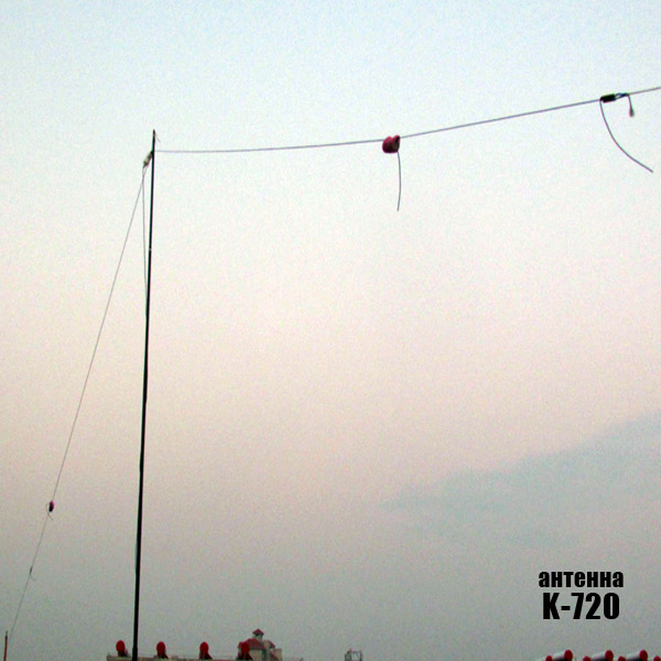 Антенна К-720 может с успехом использована, как в качестве базовой антенны, так и в качестве легкой, компактной походной антенны. Конструктивно K-720 представляет собой In V с удлиняющими катушками на диапазон 7 Мгц. Общая длина антенны всего 12,5 м, что позволяет без лишней острастки усыновить ее, как на крыше многоэтажного здания, так и при помощи небольшой мачты (8-10 м) на земле.